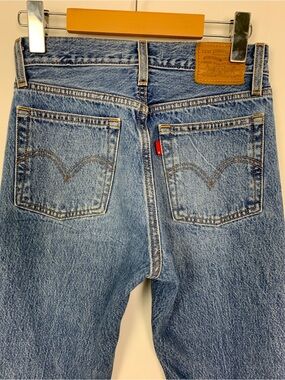 Mid rise Levi’s Wedgie Straight jeans with ripped knees, raw hems and that classic denim feel. Straight leg cut with a cropped ankle length and authentic vintage-style wash. Button fly front with signature leather patch and red tab.