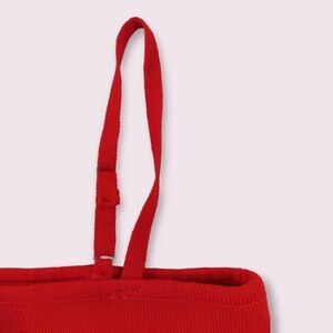 LF Seek the label cherry red scrip top. Form fitting with adjustable spaghetti straps. Square neckline.