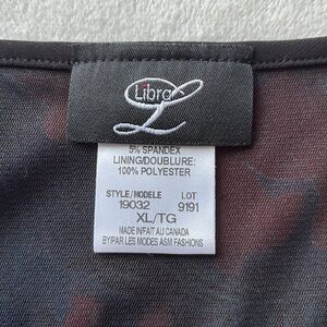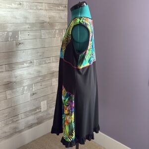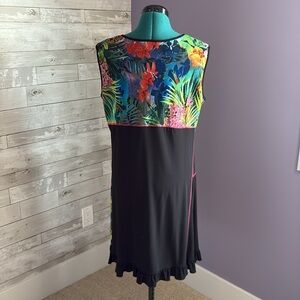 Vibrant dress with a tropical print. Features a mix of green, blue, pink, and yellow colors. Absolutely stunning for a vacation!