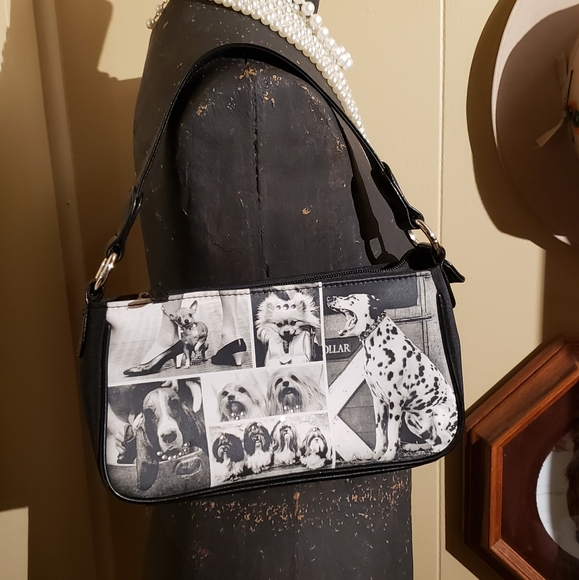Delightful shoulder bag. Features black and white photos embellished with rhinestones. Like new.