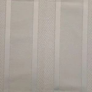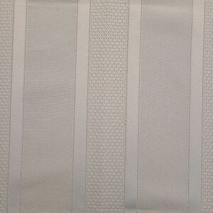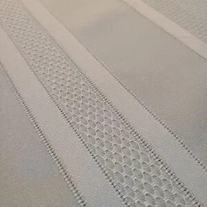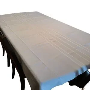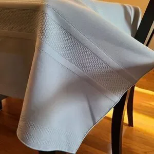 Light blue fabric with a crochet-like pattern stripes along length of tablecloth
