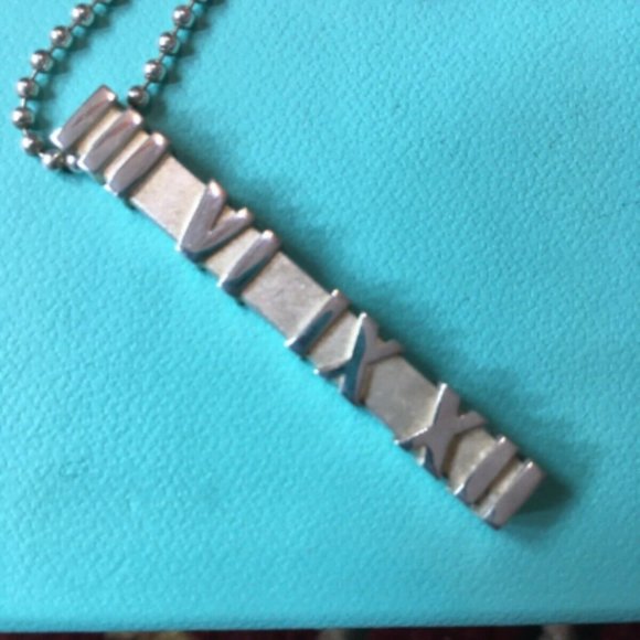 This is a lovely atlas bar design in sterling silver from Tiffany & Co. The gorgeous pendant measures 2 inches and sits on a 20" beaded Tiffany chain. Perfect for a man or a woman.