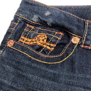 2947 LIKE NEW CONDITION !! PREMIUM STRETCH WEAVE DENIM !! GORGEOUS TWO COLOR METALLIC TONE JAPANESE STITCHING !! EMBROIDERED BACK POCKETS !! NOT ALTERED STONEWASHED 8” MIDRISE VINTAGE QUALITY DENIM and BOLD style