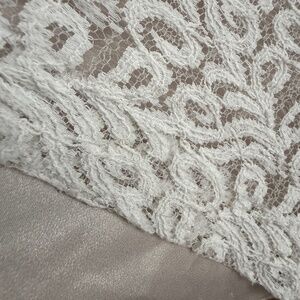 Very pretty a-line white lace shift dress with satin trim that can be worn as a dress or tunic. Can change the look by wearing different colour of undergarments.