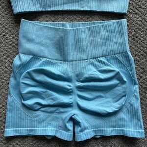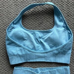 LIKE NEW matching workout set (top and bottoms included). The prettiest blue colour. Bra and shorts both size medium (accommodating due to stretch). Halter sports bra with removable pads. Extremely flattering fit of shorts. The gym girlies get it, iykyk. Only worn a handful of times. No flaws. No brand tag on this set.