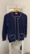 Stylish navy cardigan with white trim. Features two front pockets. Perfect for layering.