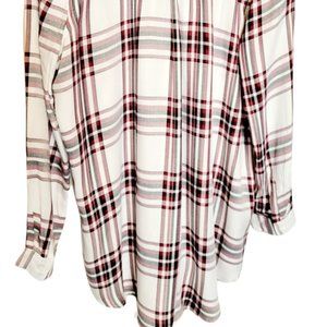 The fabric has a white background with a burgundy and gray plaid pattern throughout. The sleeves are long and button cuffed. There are two breast pockets on the tunic. This tunic can be belted, or just wear it as is.