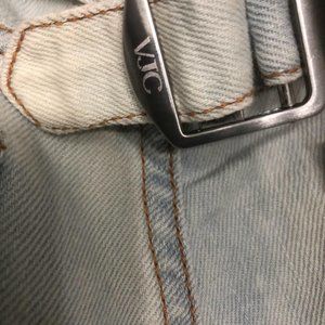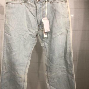 LIGHT BLUE WASH DENIM. SLIM STRAIGHT LEG. SEE PICS FOR FULL DETAILS FETURES SIGNATURE BUCKLE BACK FOR ADJUSTMENTS AND LEATHER SIGNATURE PATCH ON POCKET.