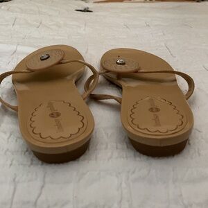 LINDSAY PHILLIPS medallion tan patent sandals thongs size 9.5