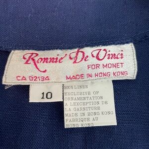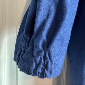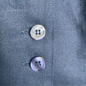 Button down top is 100% linen with removable shoulder pads, elastic panel sleeves, and back tie. Navy hued and has some weight to it, so could be worn as an over layer piece. (it’s almost canvas like). Marked size 10 and in EUC.