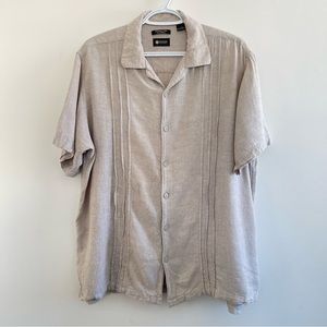 Washable Linen Short Sleeve Shirt Top A sexy, breezy, short sleeve, shirt with a straight-cut hem for a cool, casual appeal. If you're seeking a timeless, elegant linen shirt, try this linen shirt. A staple for any summer wardrobe and perfect for your beach wedding! * Plain weave * neutral beige solid color * classic neckline * short sleeves * button closing * machine washable linen * 55% linen; 45% rayon Excellent condition Tagged a Men's Size Large * Could fit various sizes depending on fit preferences. See measurements for fit accuracy. ** LISTED UNDER VARIOUS SIZES BUT ONLY SELLING THE ONE SHIRT Approximate Measurements Laid Flat: Armpit to armpit - 24" Length from bottom back collar to hem - 29" A sexy, breezy, short sleeve, shirt with a straight-cut hem for a cool, casual appeal. If you're seeking a timeless, elegant linen shirt, try this linen shirt. A staple for any summer wardrobe and perfect for your beach wedding!