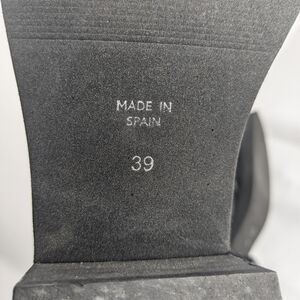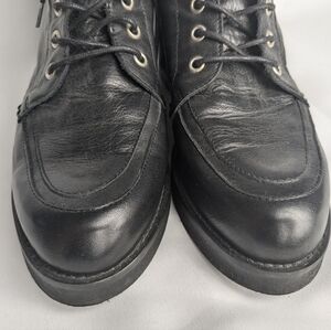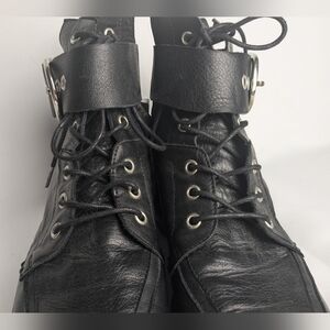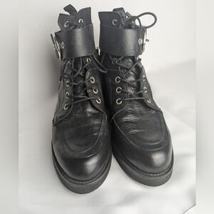 Stylish black ankle boots with lace-up design. Features a bold buckle strap. Perfect for any occasion.