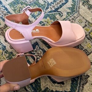 Chic baby pink platform sandals with buckle strap.