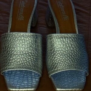 Chic silver mules with a textured finish. Perfect for adding shine to any outfit.