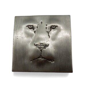 This exquisite pewter brooch, masterfully crafted by JJ, showcases a minimalist yet striking depiction of a lion's face.