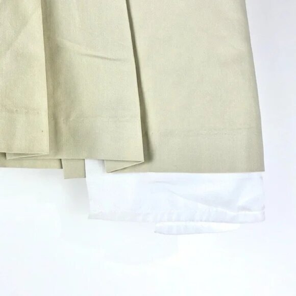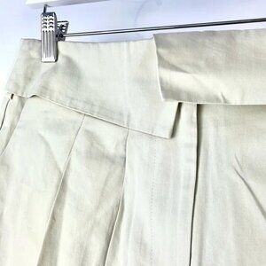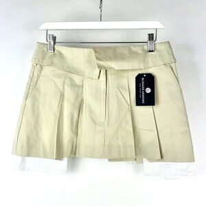 This mini skirt from LIONESS is made in a Beige lightweight non-stretch twill, and features a low-rise, a fold-over envelope-style waistband, a front zipper and hook closure, belt loops, slanted side pockets with exposed white lining, and is pleated throughout.