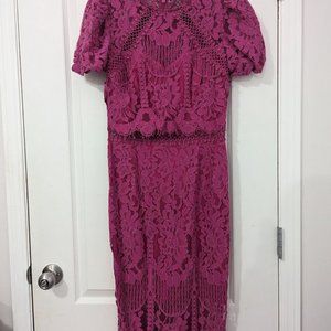 A statement evening dress rendered in floral lace, featuring balloon sleeves and a tied back.