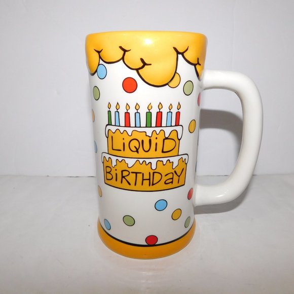 This LIQUID BIRTHDAY party Large Drinking Mug is in Great clean bright condition free of chips, crack or Crazing. One Sie says LIQUID PARTY on one side and the other side says IT"S A PRESENT AND A PARTY ALL IN ONE! Great Birthday Gift. Produced by Our Name is Mud - Hand Painted by Lorrie Veasey . Mug measures 6" tall - 3.25" in diameter at opening.