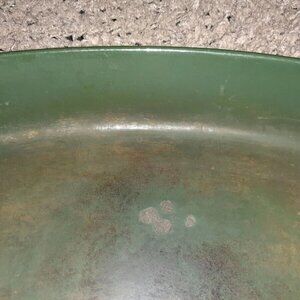 Both cover and pan are in decent pre-owned condition with staining from use. There are a couple of dings in the enamel on the pan and on the edges. Please see pics for details.