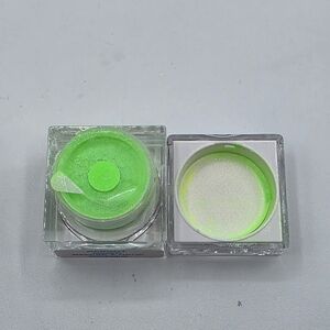 This unique reformulated blend of pure green neon powder mixed with a light green shade shift mica magically comes alive both at night and day. In light this loose pigment shows off hits of sparkle into a silky soft green shine - at the same time glowing vibrantly under black light! Electrics can be applied wet or pressed on dry over primer.