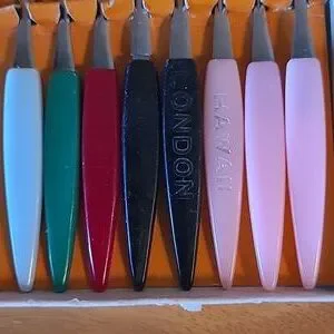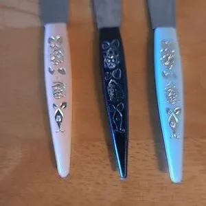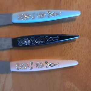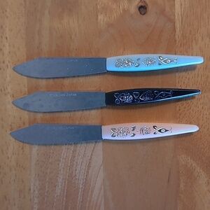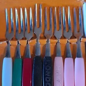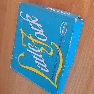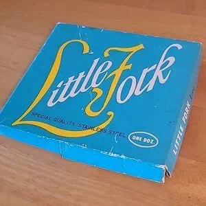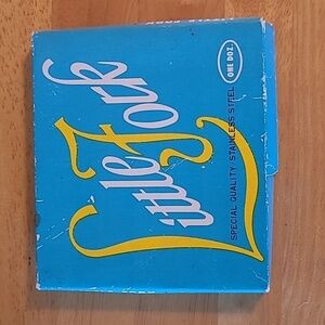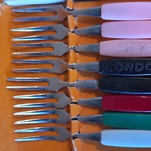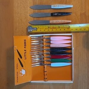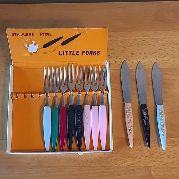 Special quality stainless steel tines and blades made in Japan in the 1960’s. The little forks and knives come in an original Little Forks box. The box measures approximately 4.5" x 5". The forks and knives have plastic handles and measure approximately 4” long. These would be great for serving appetizers for an evening or dinner party! These will make your next cocktail party the talk of the town.