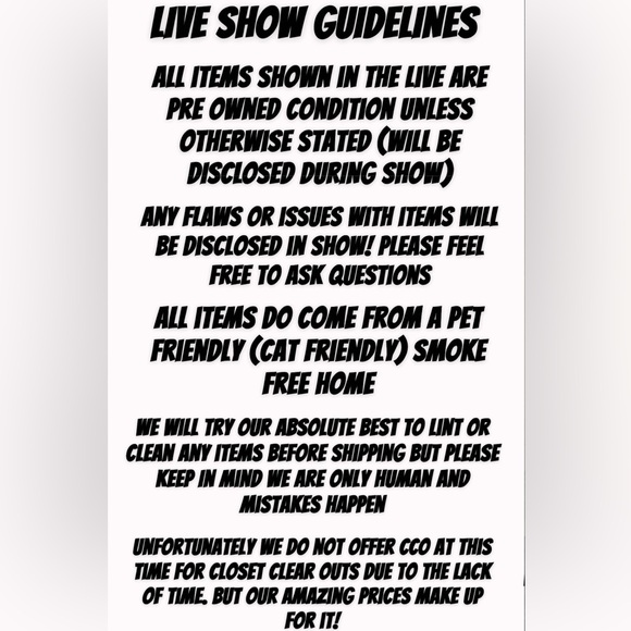 All items show in the live shows are pre owned condition some may be NWT and will be disclosed in the show!