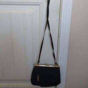 Black bag by Villager, Liz Claiborne, 100% Polyester, with strap, one outer zip pocket with pull tag, one inner zip pocket, kiss clasp closure. Gold tone hardware. Made in China.