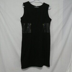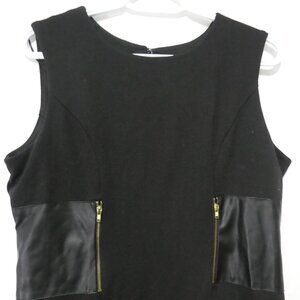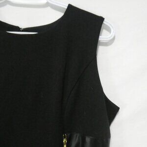 Chic black sleeveless dress featuring sleek faux leather side panels with zipper accents for a modern touch
