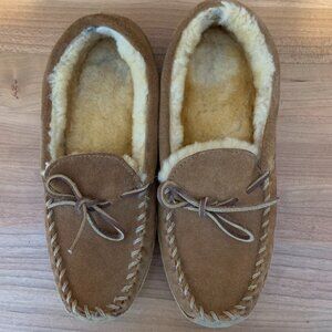 LL Bean Classic Moccasins Childrens Size 4 Suede Faux Fur With Suede Tie Cord