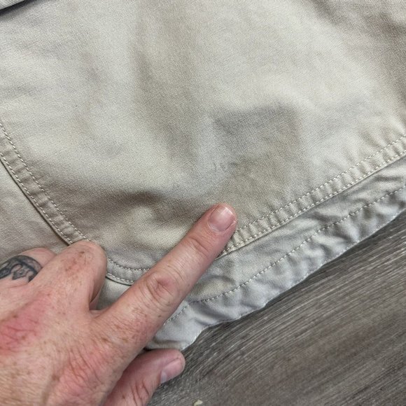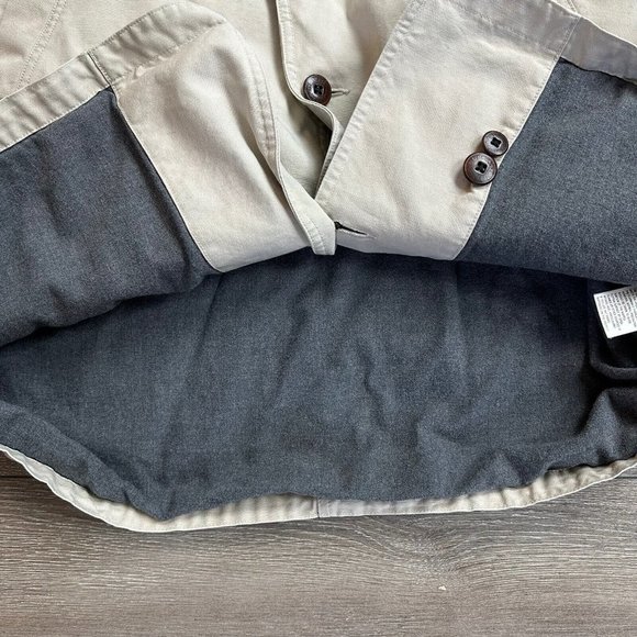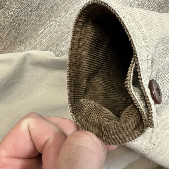Stylish L.L. Bean military field jacket. Cream body with brown collar. Durable and versatile.