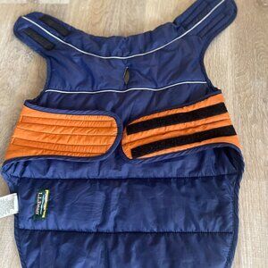 L.L Bean Dog Parka/Jacket. Item 508280. Size Medium. Length 19". Reversible. Rusty orange/Navy. Velcro closures. Excellent pre loved condition.
