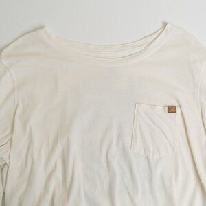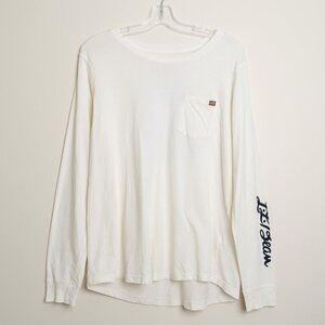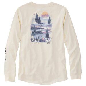 Made from soft-washed organic cotton, this long-sleeve jersey-knit pocket tee features vintage-inspired graphics celebrating our outdoor heritage. Size Medium. Measurements: Pit to pit approx. 21", Length 26" Great pre-loved condition, minor signs of wear. - Color: Off-White - Falls at low hip. Relaxed Fit. - The back features unique graphic designed in Freeport, Maine. - Ribbed neckline and cuffs. - Rounded shirttail hem. - Front chest pocket accented with L.L.Bean logo label on top edge. - 100% Organic Cotton