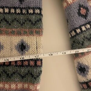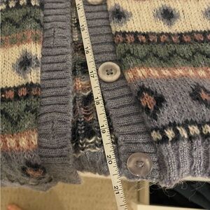 Cozy cardigan with intricate patterns. Features a mix of colors for a stylish look. Perfect for layering.