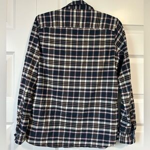 Plaid light-flannel button down shirt with a classic collar. Features a stylish navy and pink pattern. Perfect condition. Great for fall and easily layering.