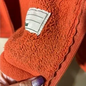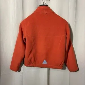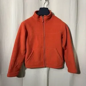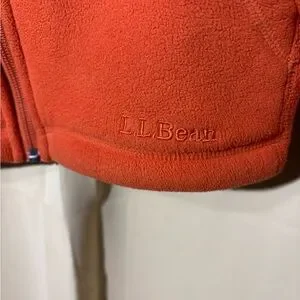 Good condition LL Bean fleece jacket in vibrant orange. Features a zip-up front. Reflective tag on back.