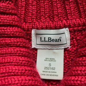 Classic and cozy L.L. Bean wool blend cardigan sweater in a rich red hue. Features a timeless cable knit pattern, collared neckline, and wooden toggle buttons for a heritage-inspired look. Mid-thigh length for extra warmth — perfect for layering in fall and winter.