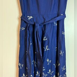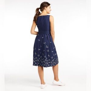This L.L. Bean Signature midi dress is a timeless, vintage-inspired piece with an elegant fit-and-flare silhouette. Crafted from 100% cotton, it features a classic navy blue color with a charming white bird print that adds a touch of whimsy. The structured bodice and pleated skirt create a flattering, feminine shape, while the self-tie waist belt enhances the fit. Perfect for everything from casual outings to garden parties, this dress is effortlessly chic and easy to style.