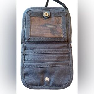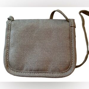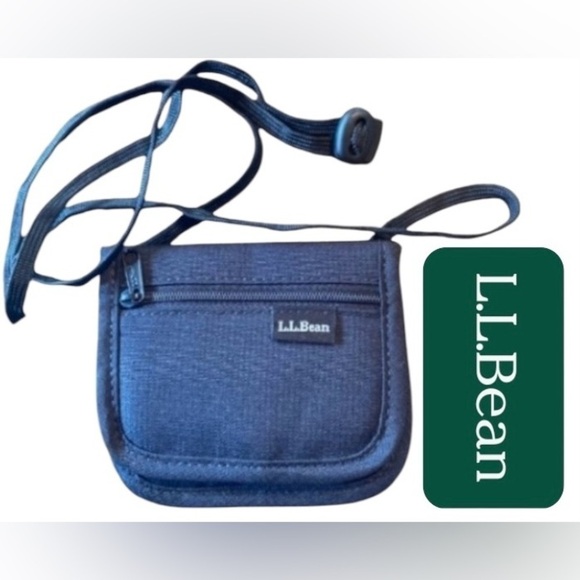 L.L. Bean Wallet. 4x5 inches. Features card holders and an adjustable lanyard to wear as a crossbody wallet.