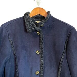Elevate your winter wardrobe with this L.L. Bean navy faux fur button-down coat. In great pre-owned condition with minimal signs of wear there are some flaws, markings and places where some of the suede material have come off (refer to photos).
