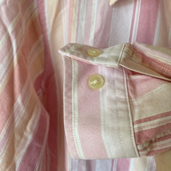 L.L. Bean coastal grandma striped pink button down top. Size Large petite. More of a boyfriend, boxy fit. Cute pastel, neutral tones.