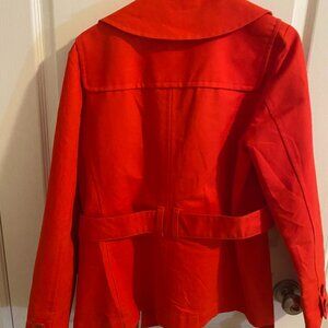 This orange red LL Bean trench is in immaculate condition since it was hardly ever worn. It is like new in shape and condition. It is a size medium, with just the right fit - not oversized or too narrow. It has a nice belt to cinch the waist. It is a heavy trench, perfect for layering, and it is lined.