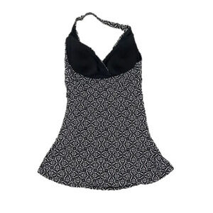 DESCRIPTION: Beautiful black and white skirted one piece halter swimsuit. Deep V front. UPF 40+, excellent UV protection. Molded cups. Ruched down the sides for a slimming effect.