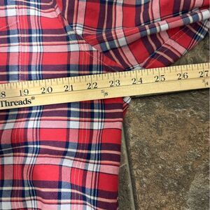 Classic red, navy, and white plaid button-down shirt by LL Bean Signature. Made from soft 100% cotton flannel, this timeless piece features a chest pocket, button cuffs, and a relaxed fit.