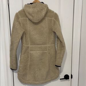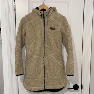 Cozy fleece jacket with a hood. Features a full zip front. Perfect for chilly days.