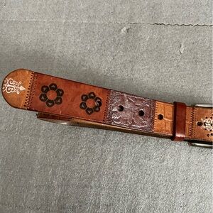 Elegant tan leather belt with intricate floral design. Ideal for enhancing any outfit.