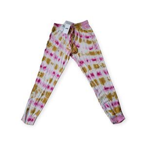 LNA Ariel sweatpants feature a vibrant fuschia and gold tie-dye pattern with a cozy, elasticized drawstring waist. Perfect for lounging in style.