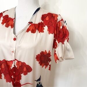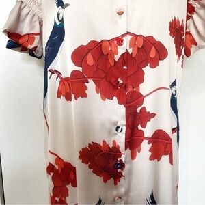 LOBO ROSA BOLERO KIMONO CREAM RED SATIN BIRD PRINT TIERED RUFFLE SHORT SLEEVE MAXI DRESS Mid-length kimono with puff sleeve and boleros at the bottom - ruffle tiered smocked elastic short sleeve - button front full lenght with a long slit on the midde front for a flowy touch - unlined - not stretch - v-neckline - pullover style. Drop waist with a loose fit full length / maxi dress. Bohemian, artsy, original, bold, bird print, soft, loose fit, boho ,gypsy, original and unique. Rare.