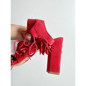 LOEFFLER RANDALL Luz Red Suede Leather Lace-Up Tassel Tie Block Heels, Size 10