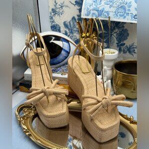 Platform sandal in natural raffia with bow detail. Features a padded leather footbed with gold stamped logo, an open toe, and an adjustable buckle ankle strap.