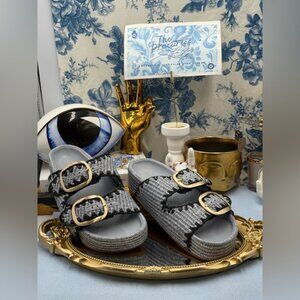 🆕 LOEFFLER RANDALL 🧿 NWOB Theo Embroidered Raffia Platform Sandal, Blue Sz 8